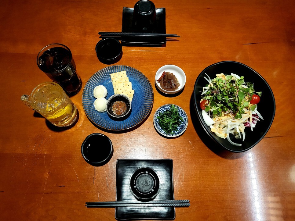 제일 먼저 나온 샐러드와 산토리 하이볼, 제로콜라, 과자가 나왔습니다.